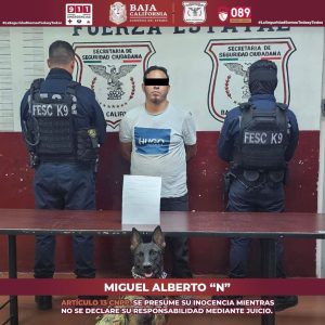Mexicali.- Un presunto homicida, quien era buscado por la justicia de Baja California desde el mes de agosto de 2024, fue capturado en la capital del Estado por agentes del Grupo de Operaciones Caninas (K-9) de la Fuerza Estatal de Seguridad Ciudadana (FESC); con este resultado se envía un mensaje firme de que la impunidad no será tolerada, y se reafirma el compromiso institucional de garantizar que quienes infringen la ley enfrenten las consecuencias.