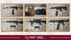 Tijuana.- La Secretaría de Seguridad y Protección Ciudadana Municipal (SSPCM), en coordinación con la Secretaría de Seguridad y Protección Ciudadana Federal (SSPCF), aseguró cinco armas largas, seis chalecos antibalas y detuvo a dos personas por presunta portación ilegal de arma de fuego en el fraccionamiento Valle de San Pedro.