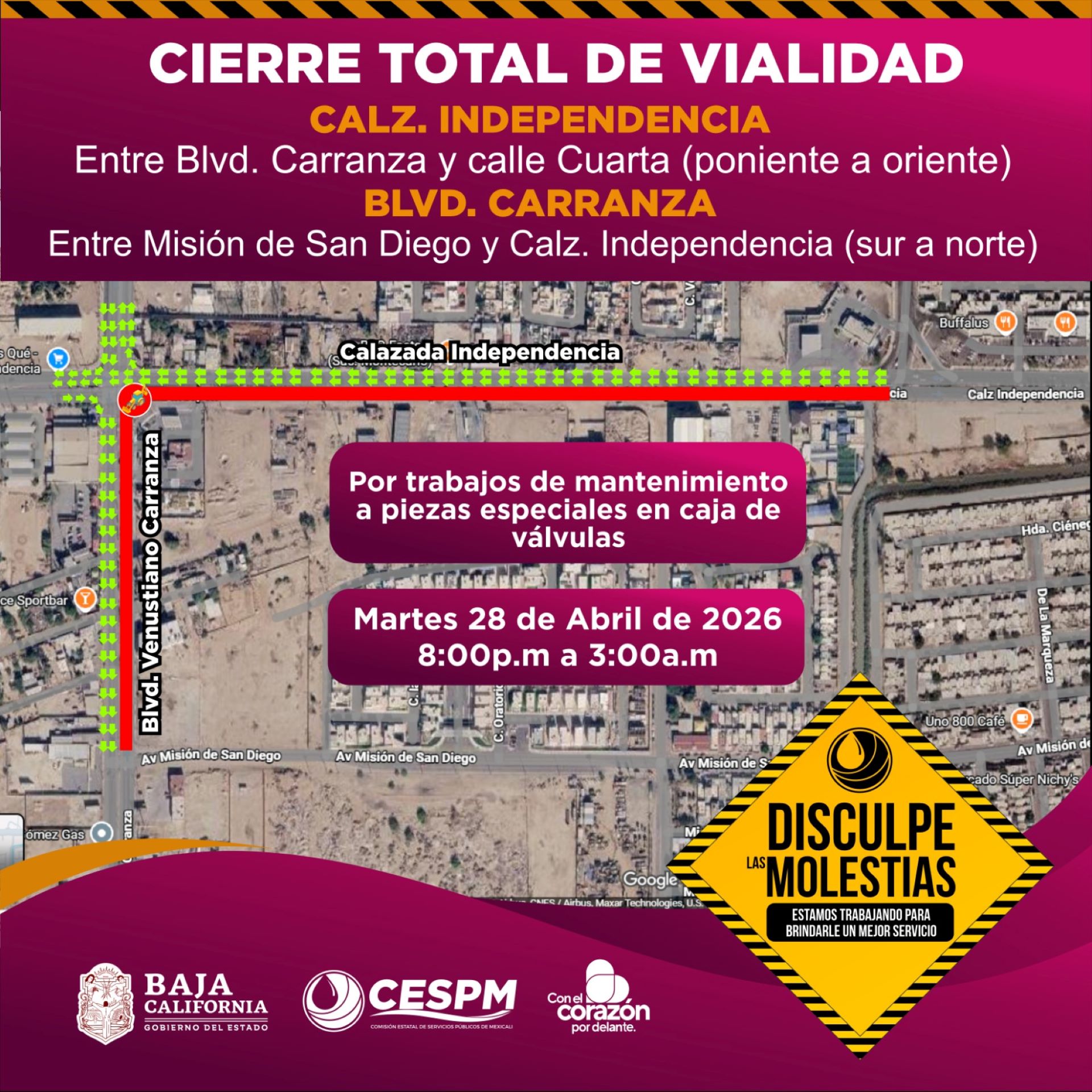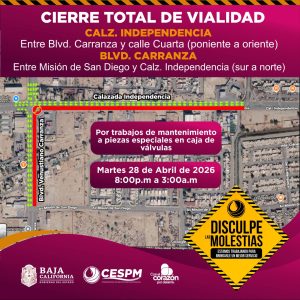 Mexicali. — CESPM informa que, con motivo de trabajos de mantenimiento a piezas especiales en la caja de válvulas, se llevará a cabo el cierre temporal de vialidades en Calzada Independencia y bulevar Carranza.