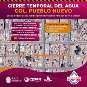 Mexicali.- La Comisión Estatal de Servicios Públicos de Mexicali (CESPM) informó sobre una serie de cierres temporales en el suministro de agua potable que se llevarán a cabo este miércoles 26 de noviembre de 2025. Estas suspensiones forman parte de trabajos programados de mantenimiento y mejora en distintos puntos de la ciudad de Mexicali y en San Felipe, con el objetivo de fortalecer la infraestructura hidráulica.