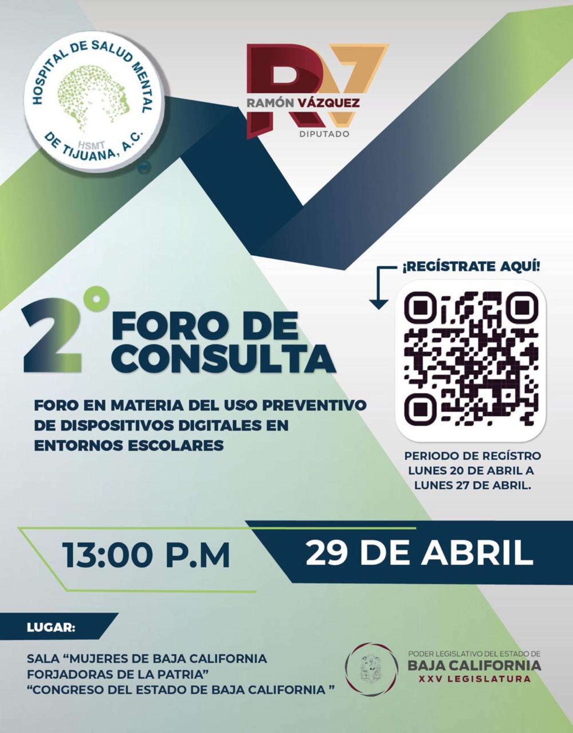 Mexicali.- El Congreso del Estado de Baja California en coordinación con el Hospital de Salud Mental de Tijuana, A.C., invitan a la comunidad educativa y ciudadanía en general a participar en el 2° Foro de Consulta en materia del uso preventivo de dispositivos digitales en entornos escolares, que se celebrará mañana miércoles 29 de abril a las 13:00 horas en la Sala Mujeres de Baja California Forjadoras de la Patria.