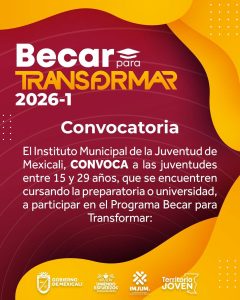 Mexicali.- El Instituto Municipal de la Juventud de Mexicali (IMJUM) abre la convocatoria Becar para Transformar 2026-1, dirigida a juventudes de 15 a 29 años que se encuentren cursando preparatoria o universidad.