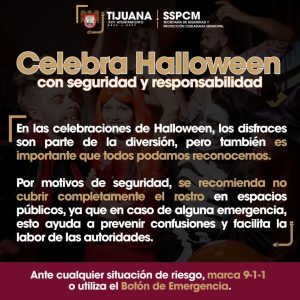 Tijuana.- Con el propósito de salvaguardar la integridad de las familias tijuanenses durante las celebraciones de Halloween, la Secretaría de Seguridad y Protección Ciudadana Municipal (SSPCM) hace un llamado a la comunidad a disfrutar estas fechas con responsabilidad y atendiendo las medidas preventivas emitidas por la autoridad.