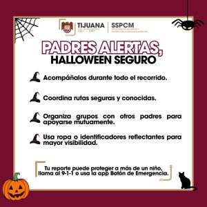 Tijuana.- Con motivo de las celebraciones de Halloween, la Secretaría de Seguridad y Protección Ciudadana Municipal (SSPCM) hace un llamado a las madres, padres y tutores a reforzar las medidas de prevención y seguridad para evitar situaciones que pongan en riesgo la integridad de niñas, niños y jóvenes.