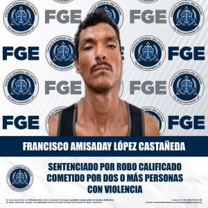 Mexicali.- La Fiscalía Regional de Mexicali obtuvo una sentencia condenatoria de cinco años y seis meses de prisión en contra de Francisco Amisaday López Castañeda, quien fue declarado culpable del delito de robo calificado cometido por dos o más personas con violencia.